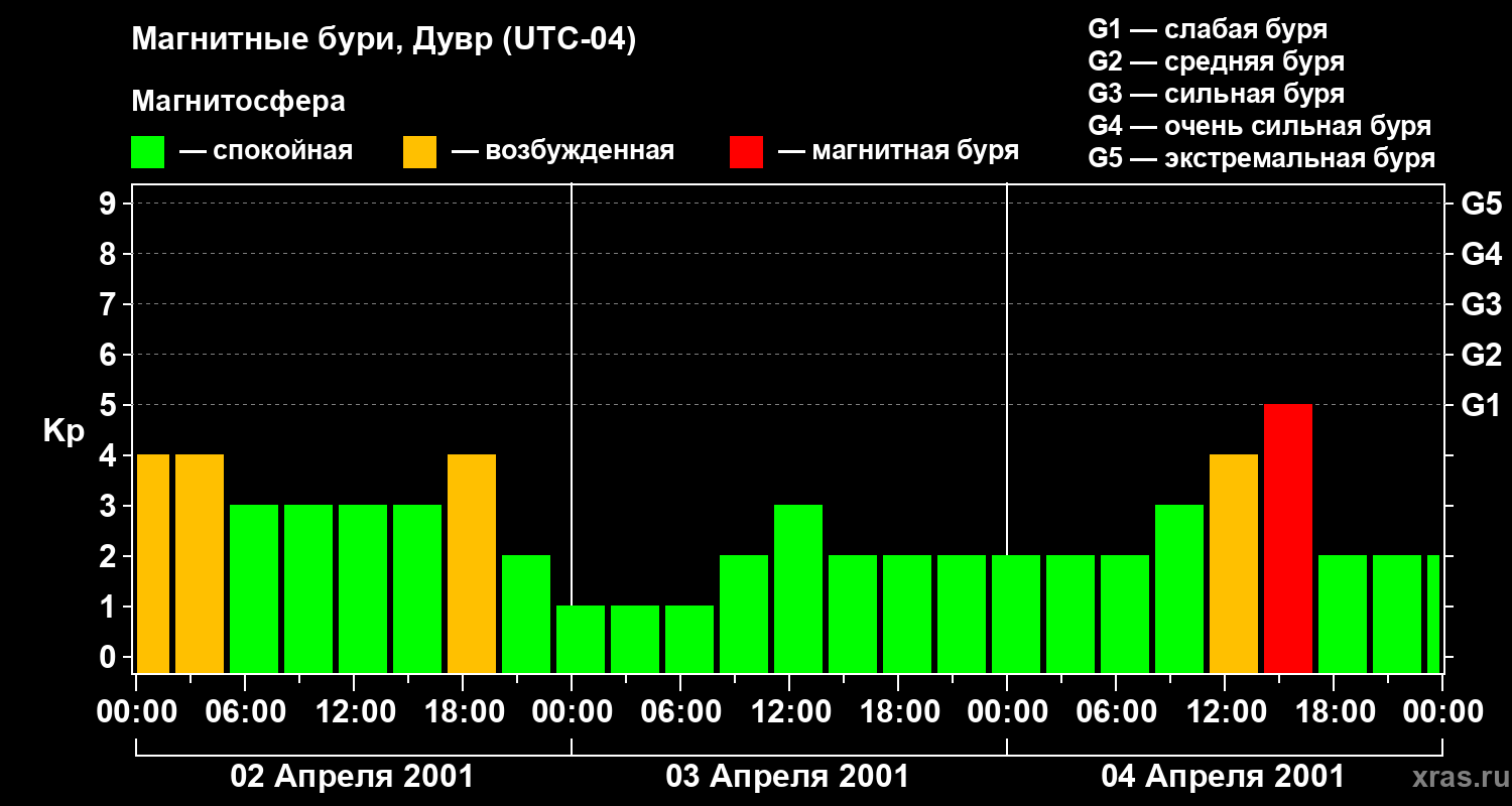 Изменения геомагнитного индекса Kp с 2 по 4 апреля 2001 года для средних широт