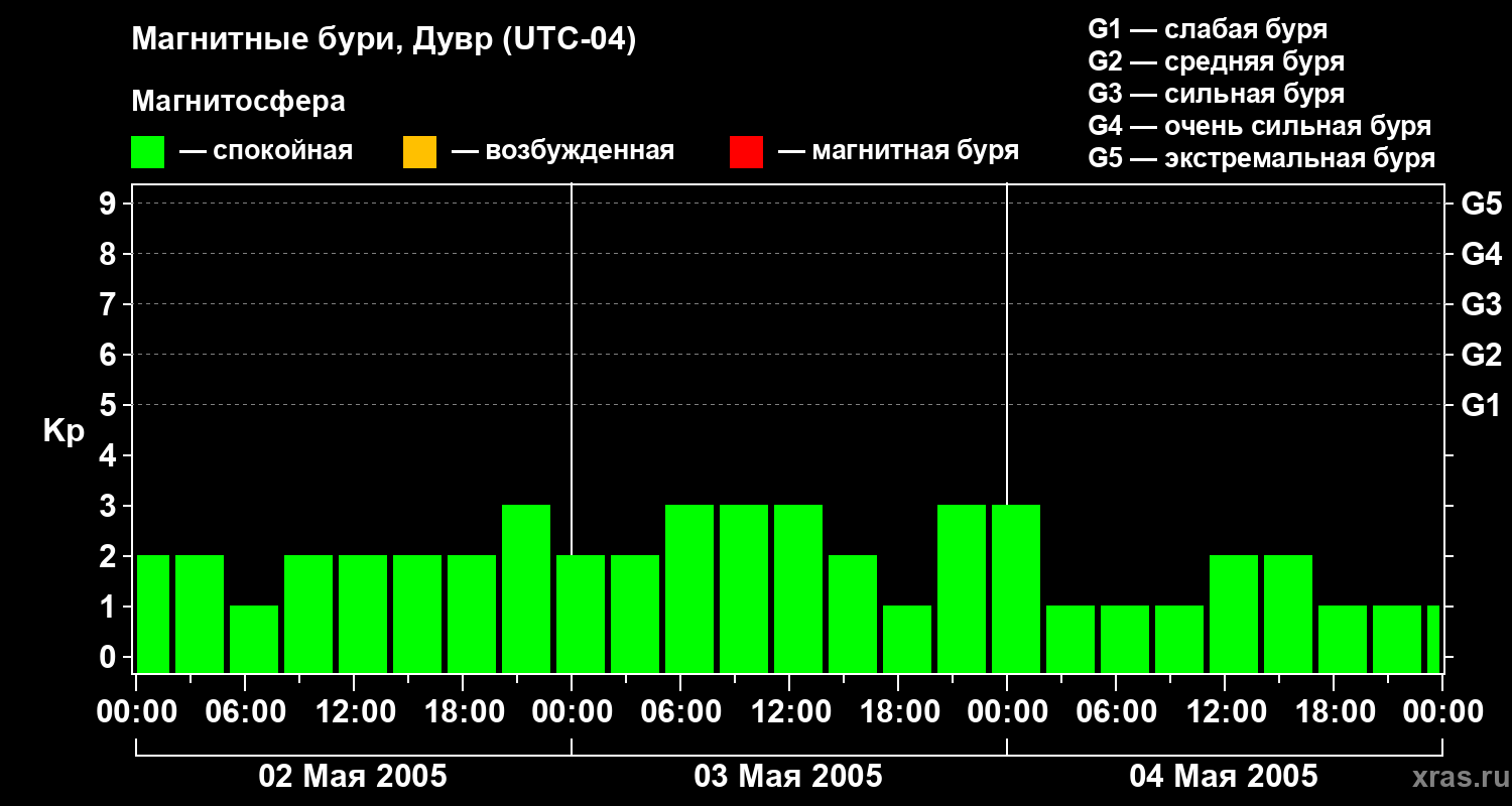 Изменения геомагнитного индекса Kp с 2 по 4 мая 2005 года для средних широт