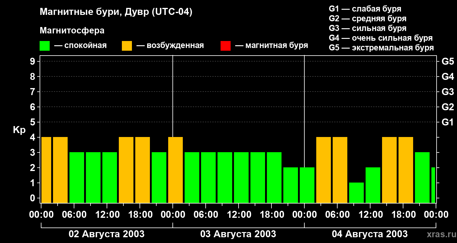 Изменения геомагнитного индекса Kp с 2 по 4 августа 2003 года для средних широт