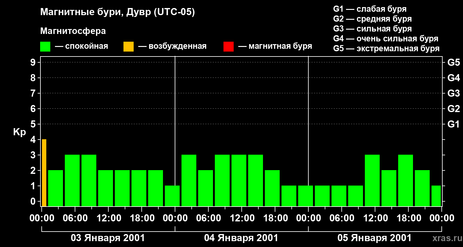 Изменения геомагнитного индекса Kp с 3 по 5 января 2001 года для средних широт
