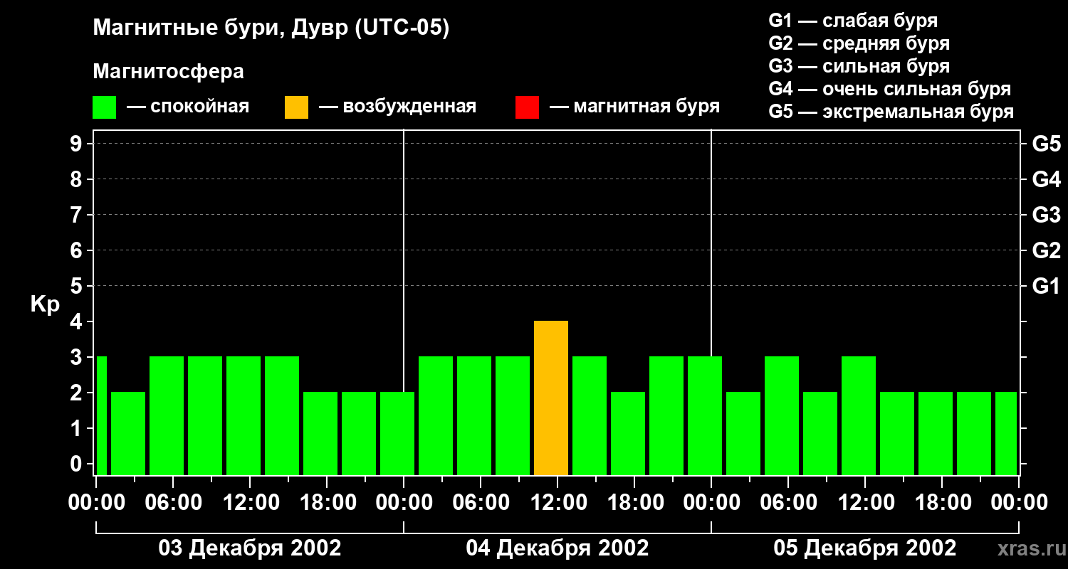 Изменения геомагнитного индекса Kp с 3 по 5 декабря 2002 года для средних широт