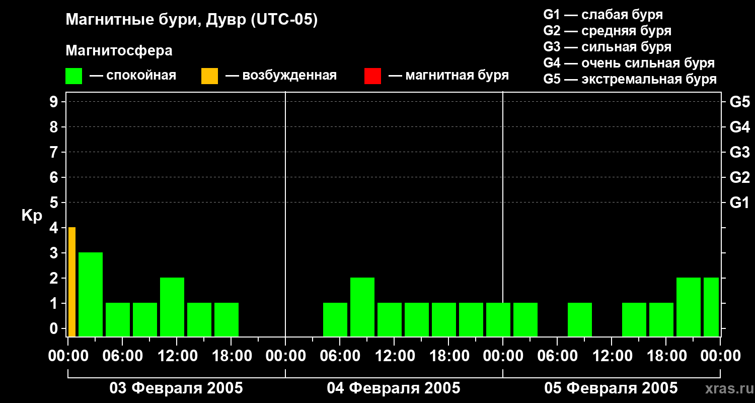 Изменения геомагнитного индекса Kp с 3 по 5 февраля 2005 года для средних широт