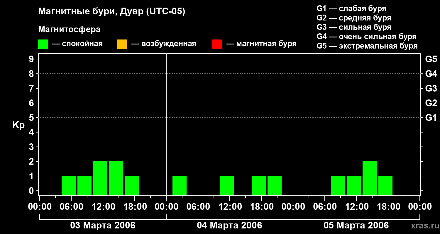 Изменения геомагнитного индекса Kp с 3 по 5 марта 2006 года для средних широт