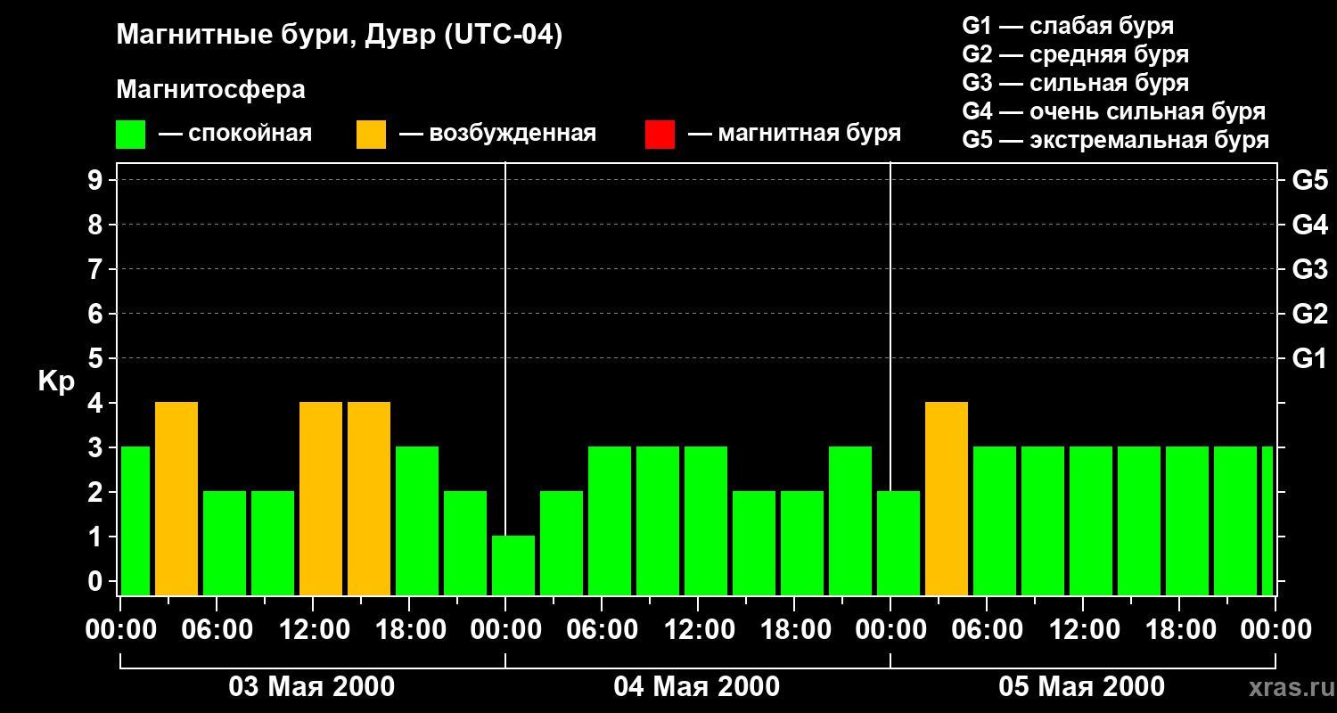 Изменения геомагнитного индекса Kp с 3 по 5 мая 2000 года для средних широт