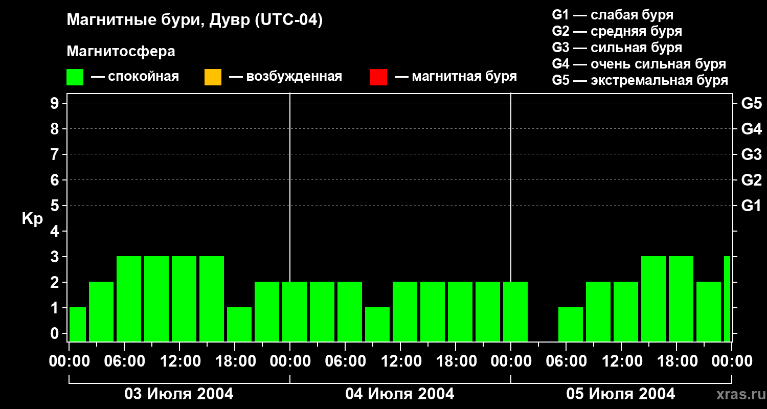Изменения геомагнитного индекса Kp с 3 по 5 июля 2004 года для средних широт