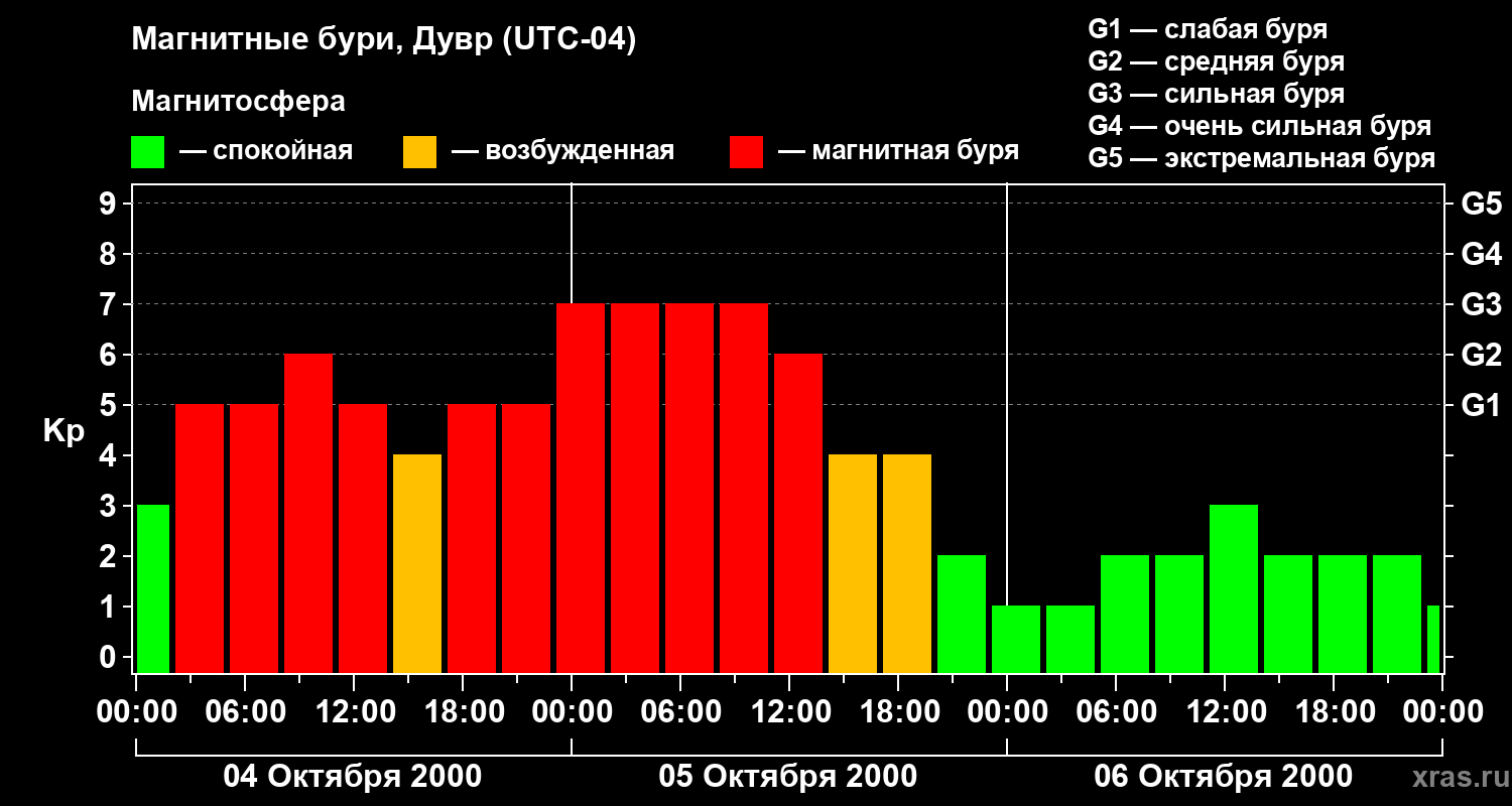 Изменения геомагнитного индекса Kp с 4 по 6 октября 2000 года для средних широт