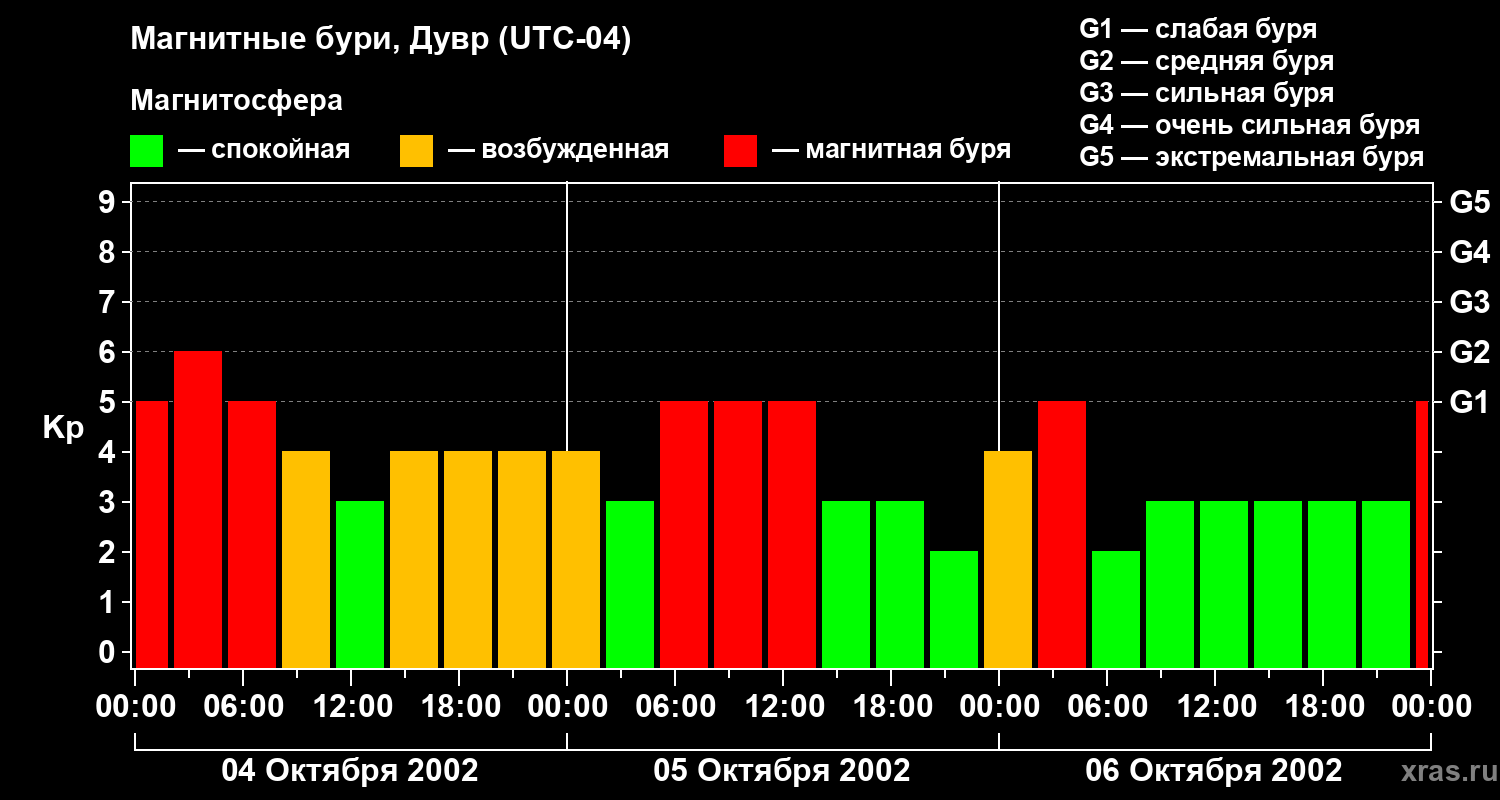 Изменения геомагнитного индекса Kp с 4 по 6 октября 2002 года для средних широт