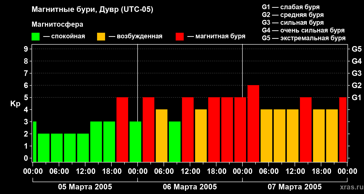 Изменения геомагнитного индекса Kp с 5 по 7 марта 2005 года для средних широт