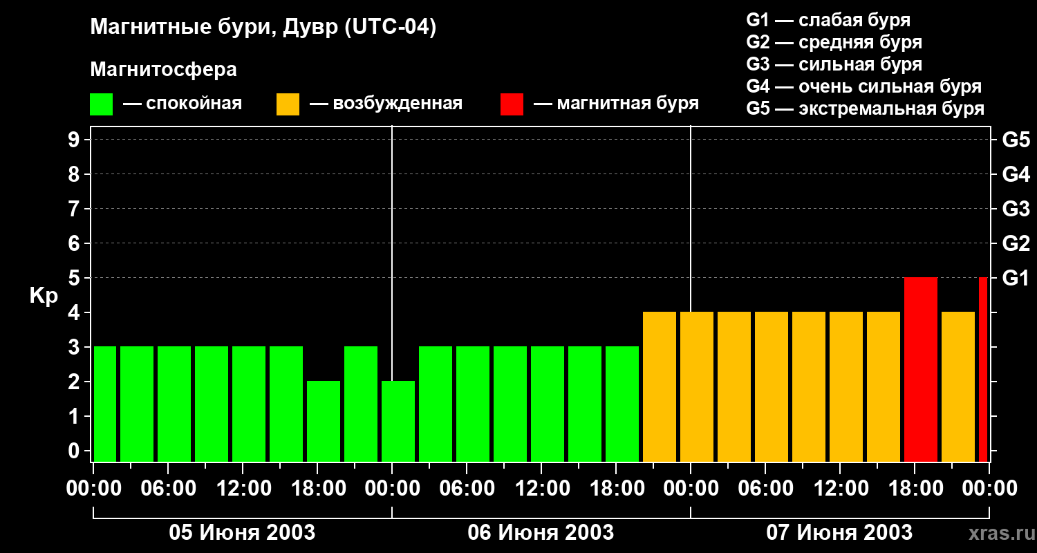 Изменения геомагнитного индекса Kp с 5 по 7 июня 2003 года для средних широт