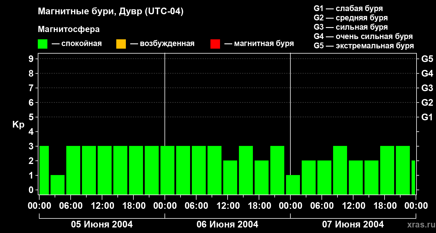 Изменения геомагнитного индекса Kp с 5 по 7 июня 2004 года для средних широт