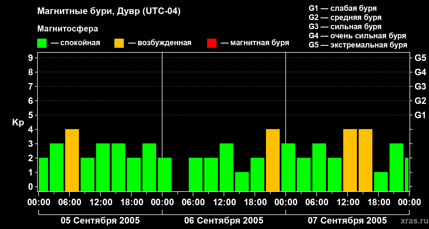 Изменения геомагнитного индекса Kp с 5 по 7 сентября 2005 года для средних широт