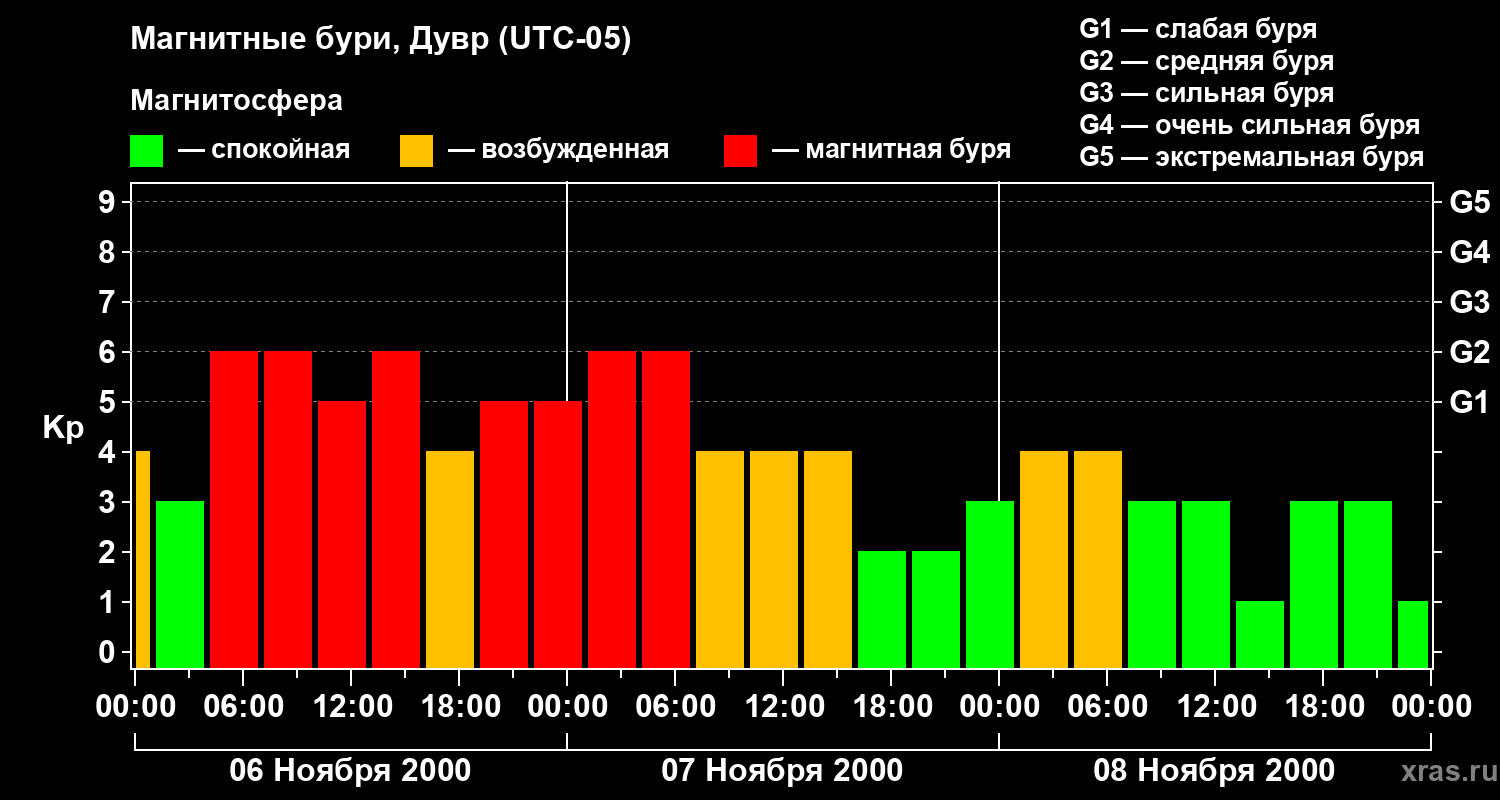 Изменения геомагнитного индекса Kp с 6 по 8 ноября 2000 года для средних широт
