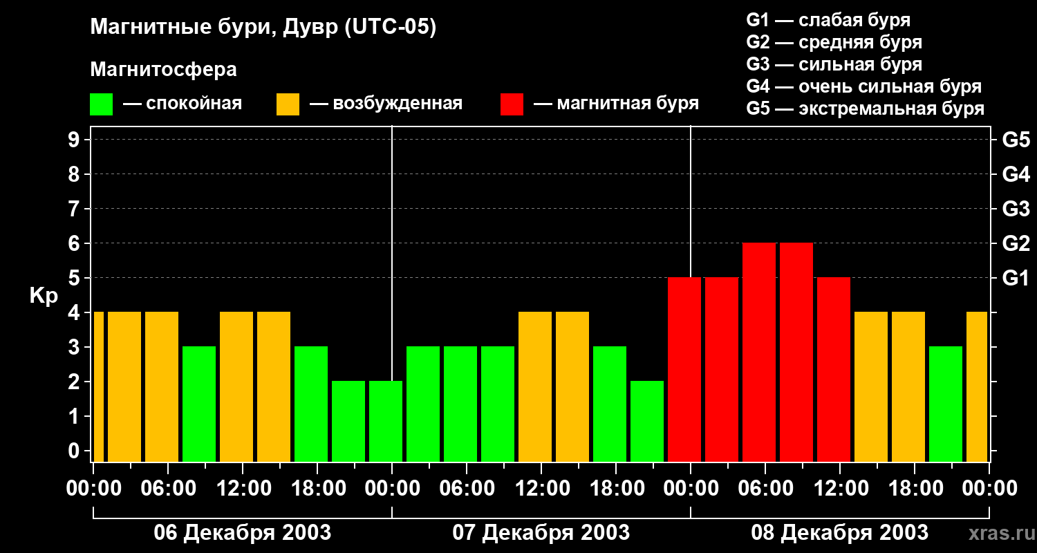 Изменения геомагнитного индекса Kp с 6 по 8 декабря 2003 года для средних широт