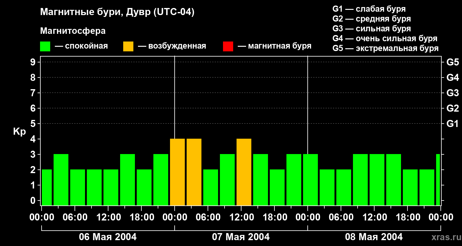 Изменения геомагнитного индекса Kp с 6 по 8 мая 2004 года для средних широт