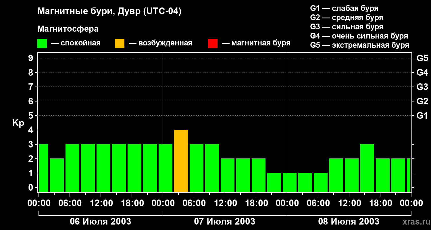 Изменения геомагнитного индекса Kp с 6 по 8 июля 2003 года для средних широт