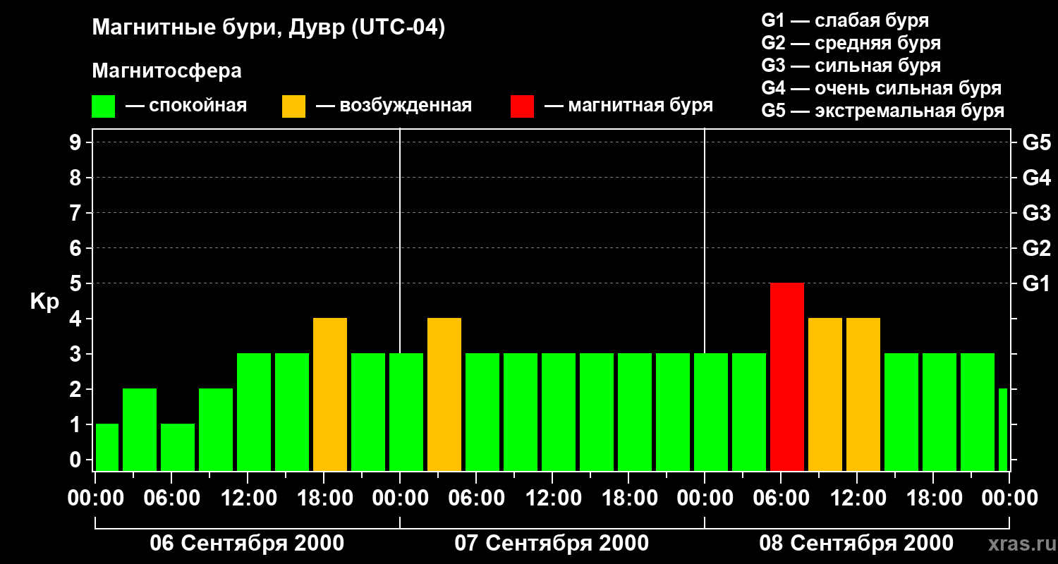 Изменения геомагнитного индекса Kp с 6 по 8 сентября 2000 года для средних широт