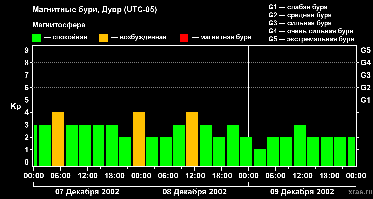 Изменения геомагнитного индекса Kp с 7 по 9 декабря 2002 года для средних широт