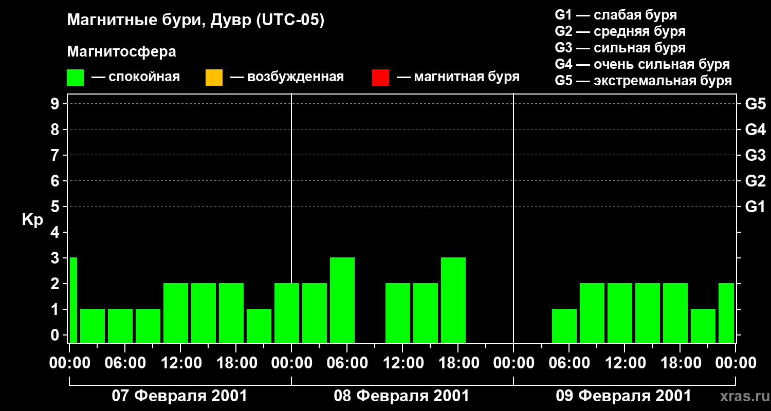 Изменения геомагнитного индекса Kp с 7 по 9 февраля 2001 года для средних широт