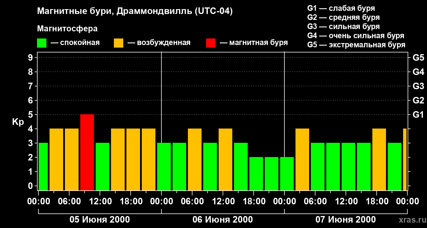 Изменения геомагнитного индекса Kp с 5 по 7 июня 2000 года для средних широт