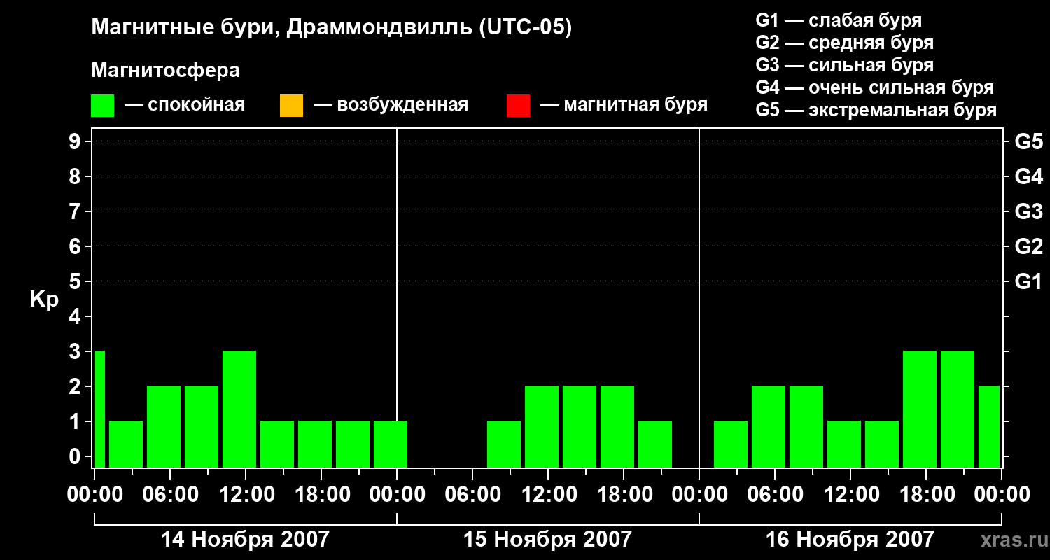 Изменения геомагнитного индекса Kp с 14 по 16 ноября 2007 года для средних широт