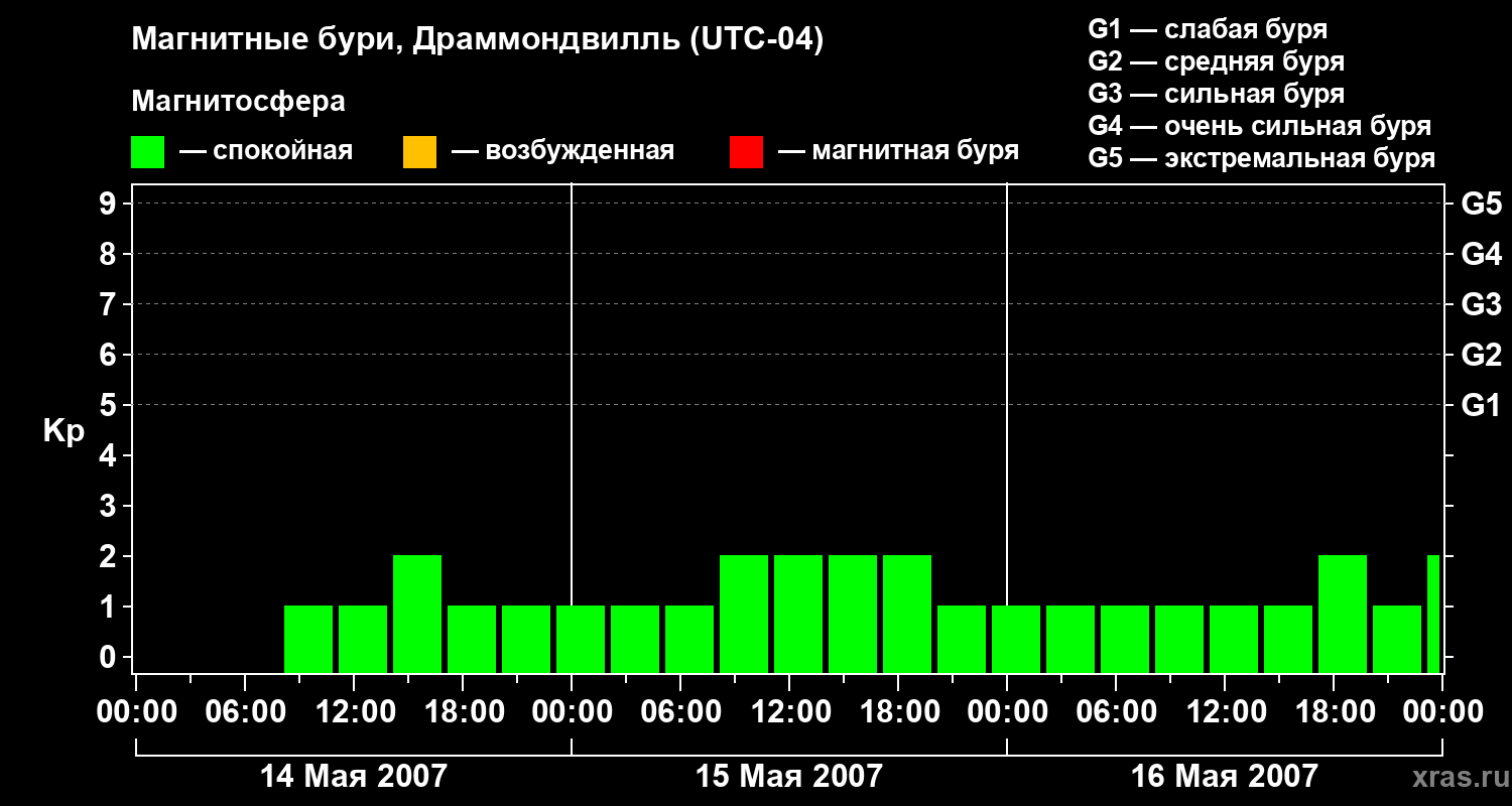 Изменения геомагнитного индекса Kp с 14 по 16 мая 2007 года для средних широт