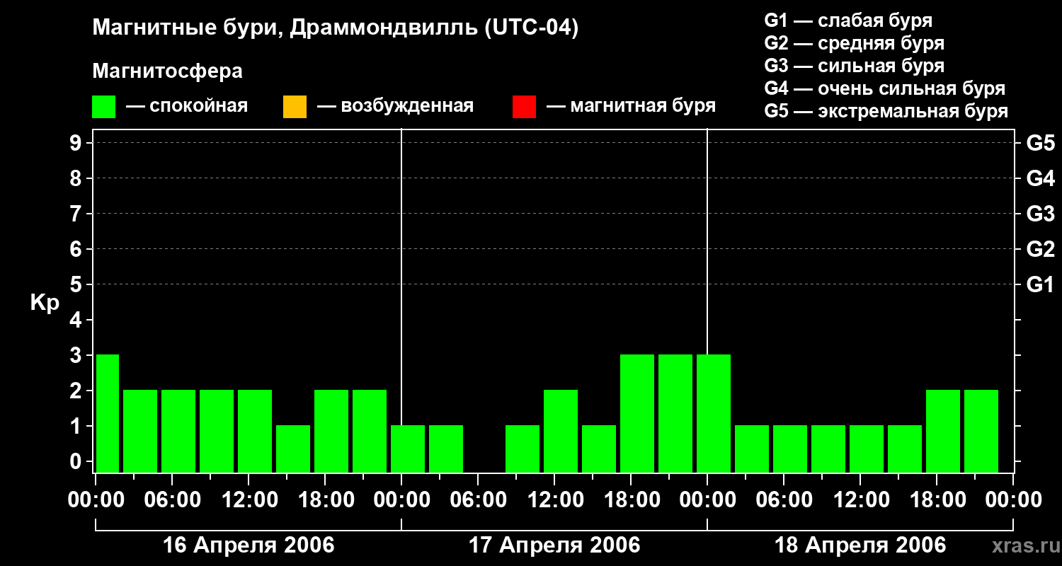 Изменения геомагнитного индекса Kp с 16 по 18 апреля 2006 года для средних широт