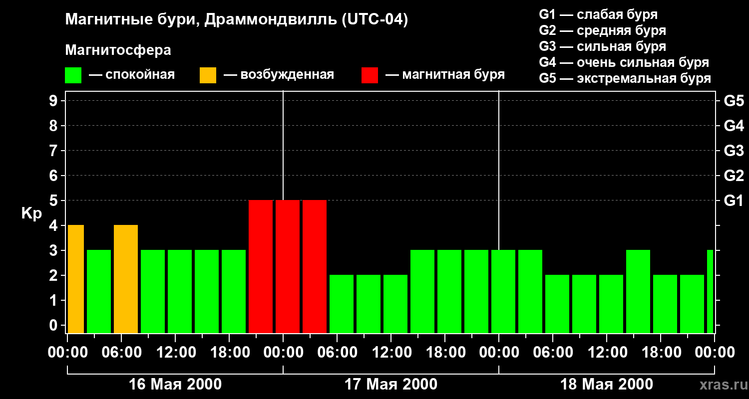 Изменения геомагнитного индекса Kp с 16 по 18 мая 2000 года для средних широт