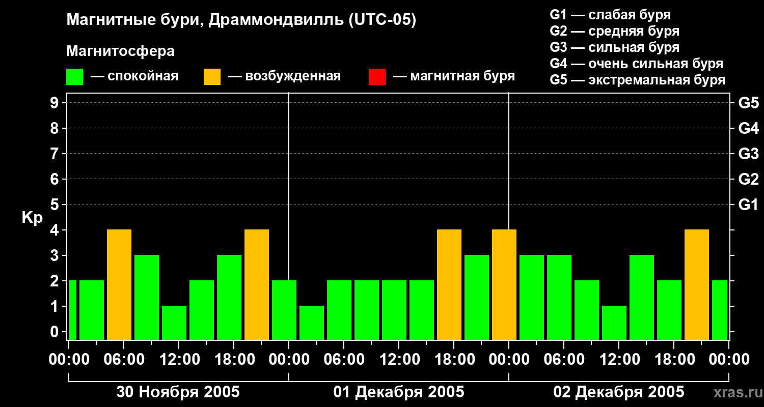 Изменения геомагнитного индекса Kp с 30 ноября по 2 декабря 2005 года для средних широт