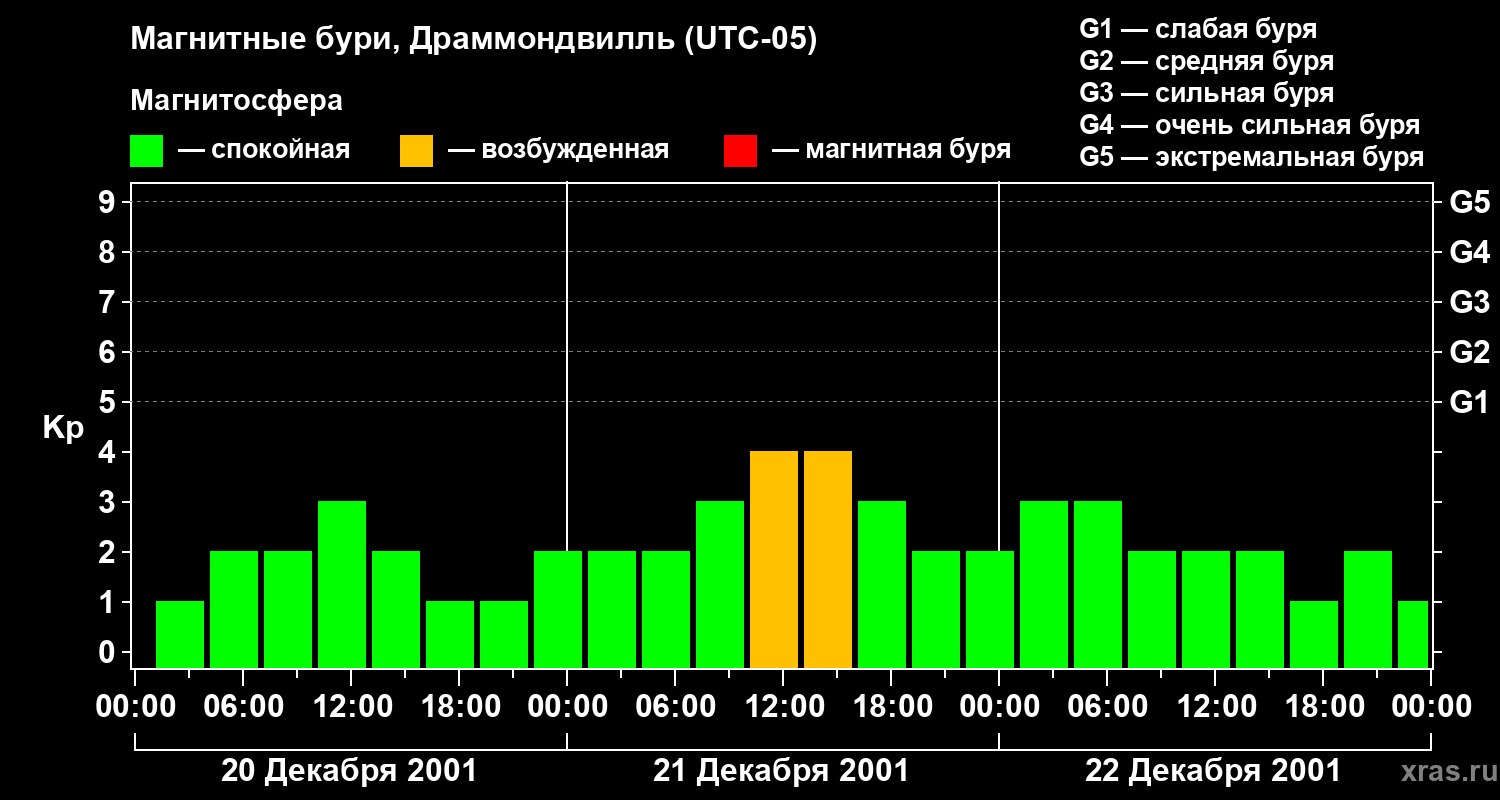 Изменения геомагнитного индекса Kp с 20 по 22 декабря 2001 года для средних широт