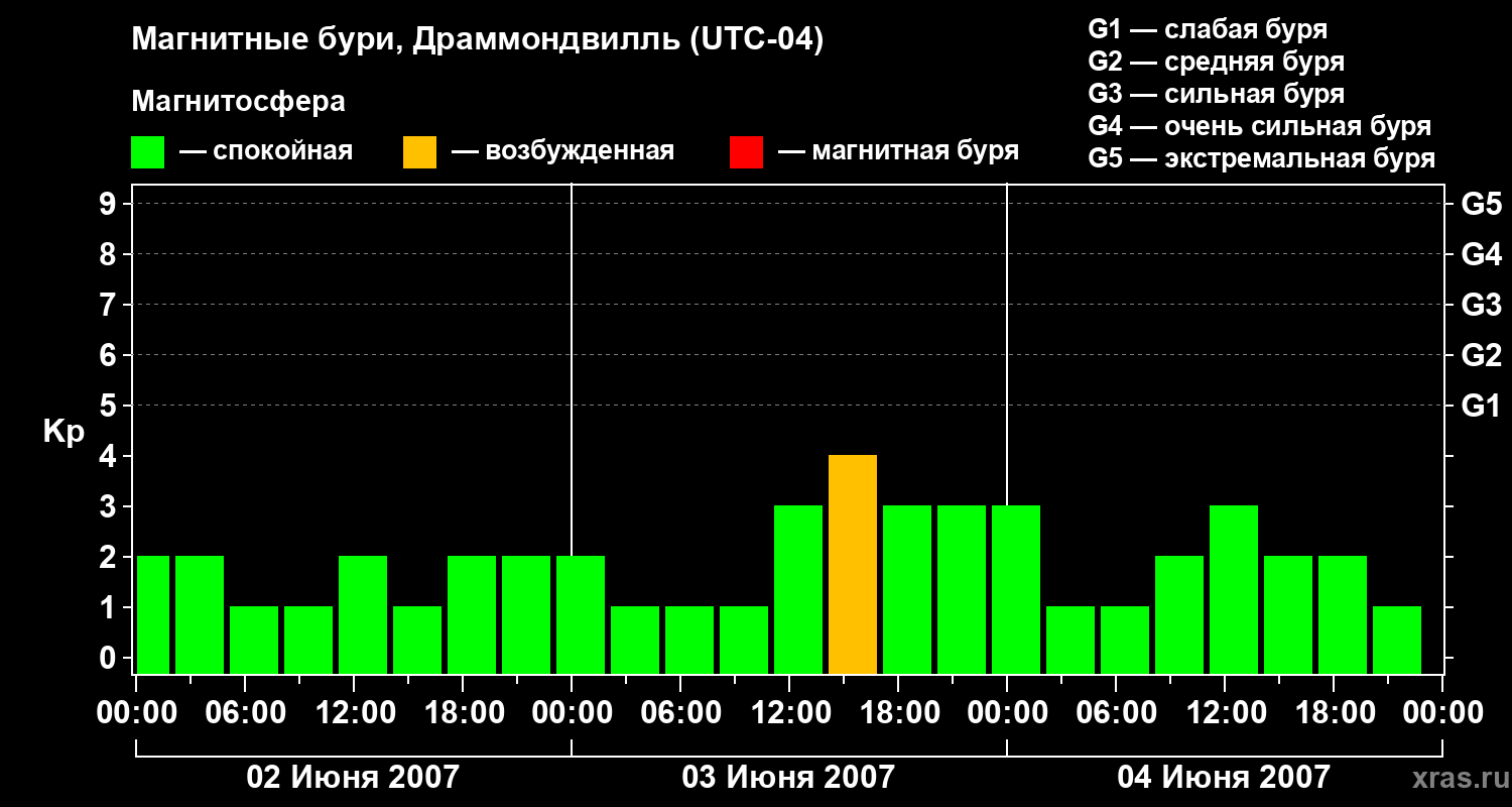 Изменения геомагнитного индекса Kp с 2 по 4 июня 2007 года для средних широт