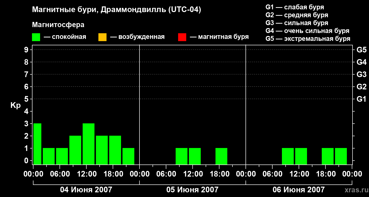 Изменения геомагнитного индекса Kp с 4 по 6 июня 2007 года для средних широт