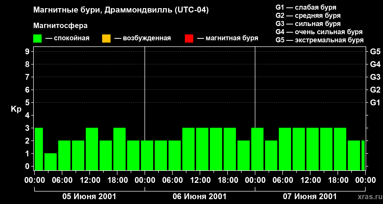 Изменения геомагнитного индекса Kp с 5 по 7 июня 2001 года для средних широт