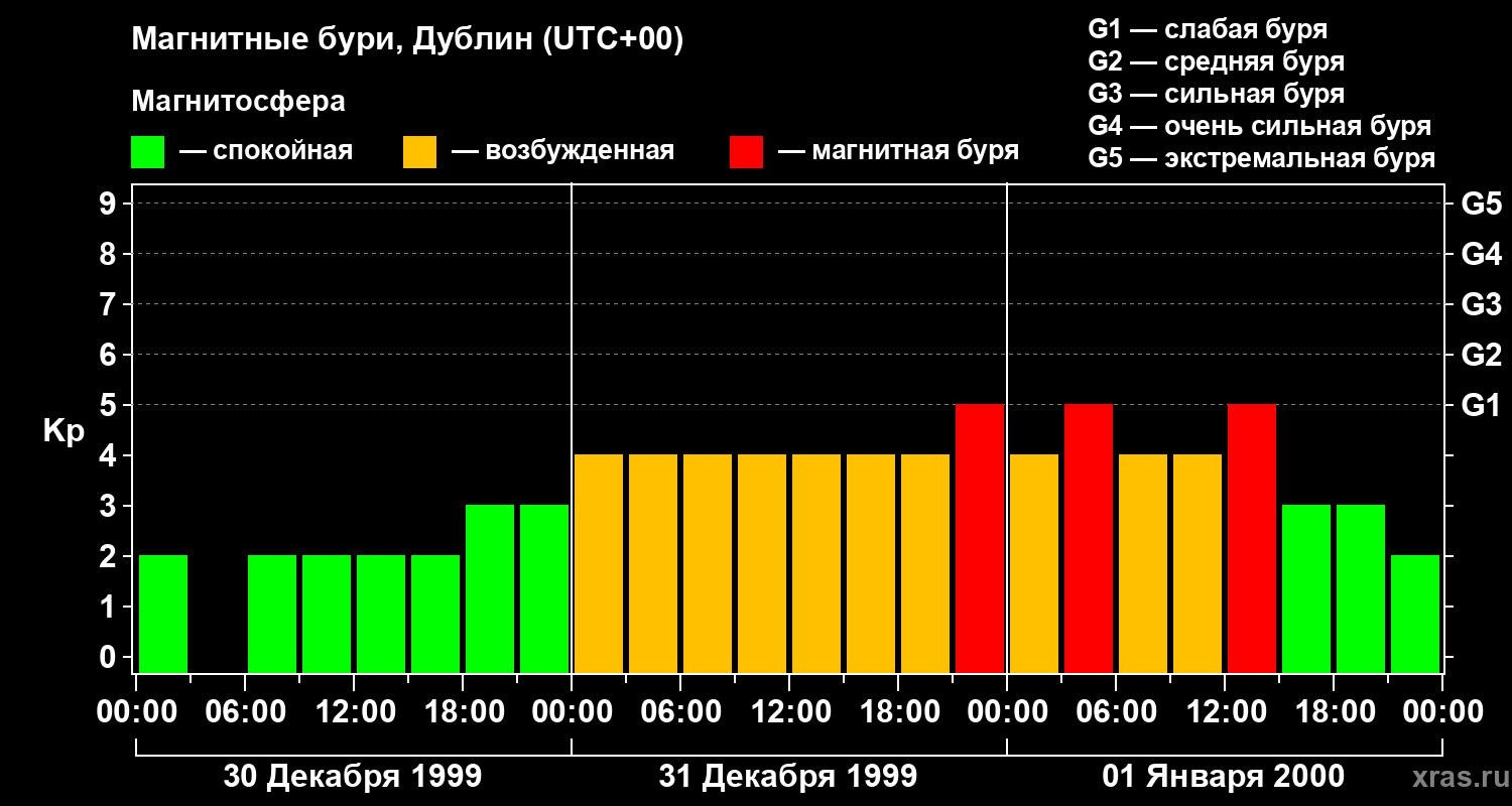 Изменения геомагнитного индекса Kp с 30 декабря 1999 года по 1 января 2000 года для средних широт