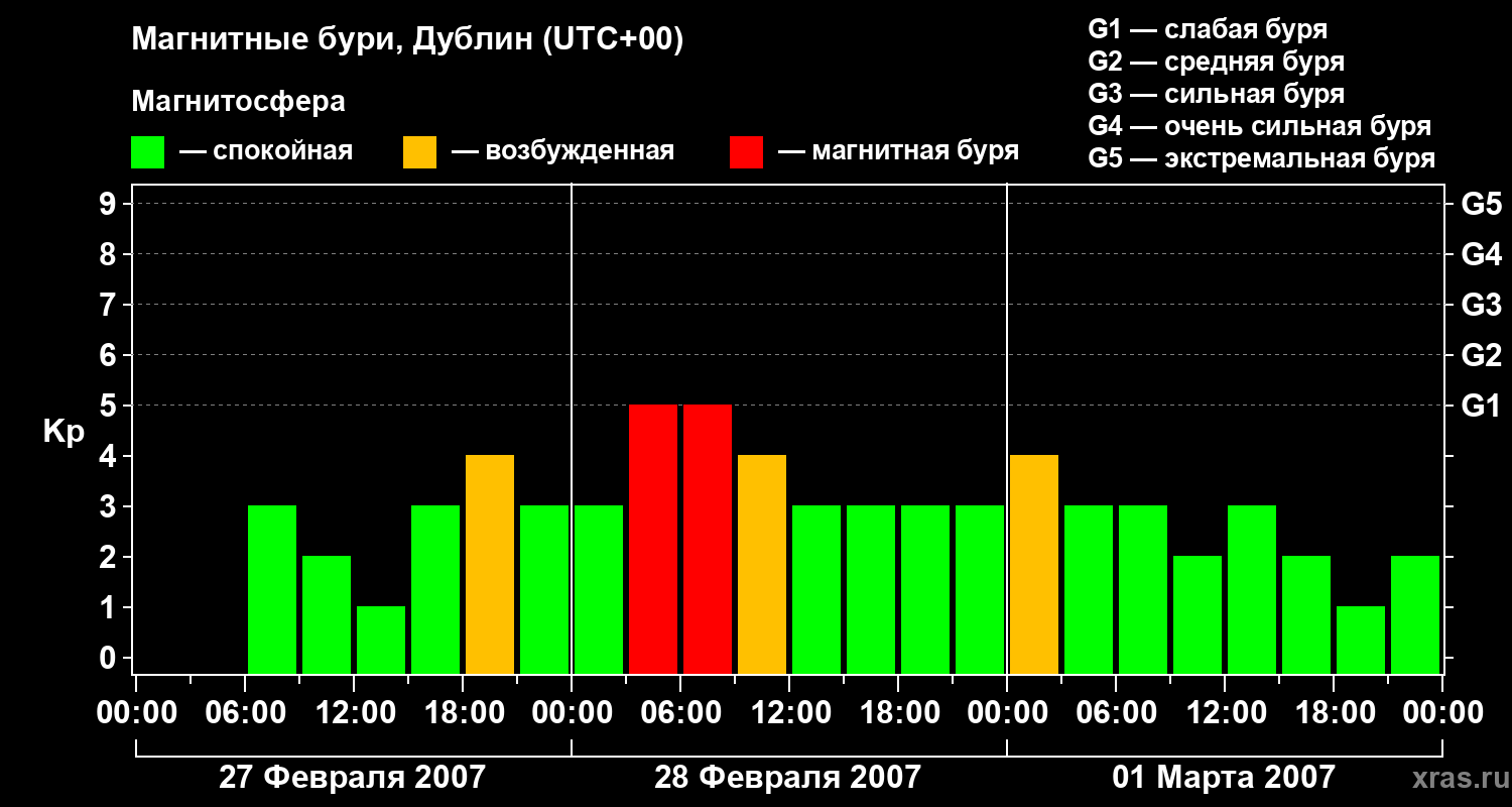 Изменения геомагнитного индекса Kp с 27 февраля по 1 марта 2007 года для средних широт