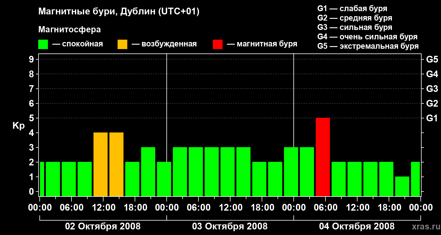 Изменения геомагнитного индекса Kp с 2 по 4 октября 2008 года для средних широт