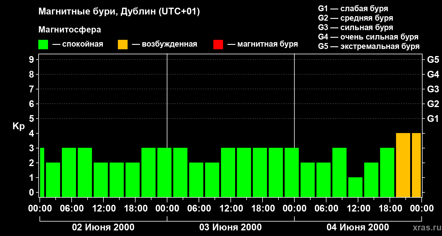 Изменения геомагнитного индекса Kp с 2 по 4 июня 2000 года для средних широт