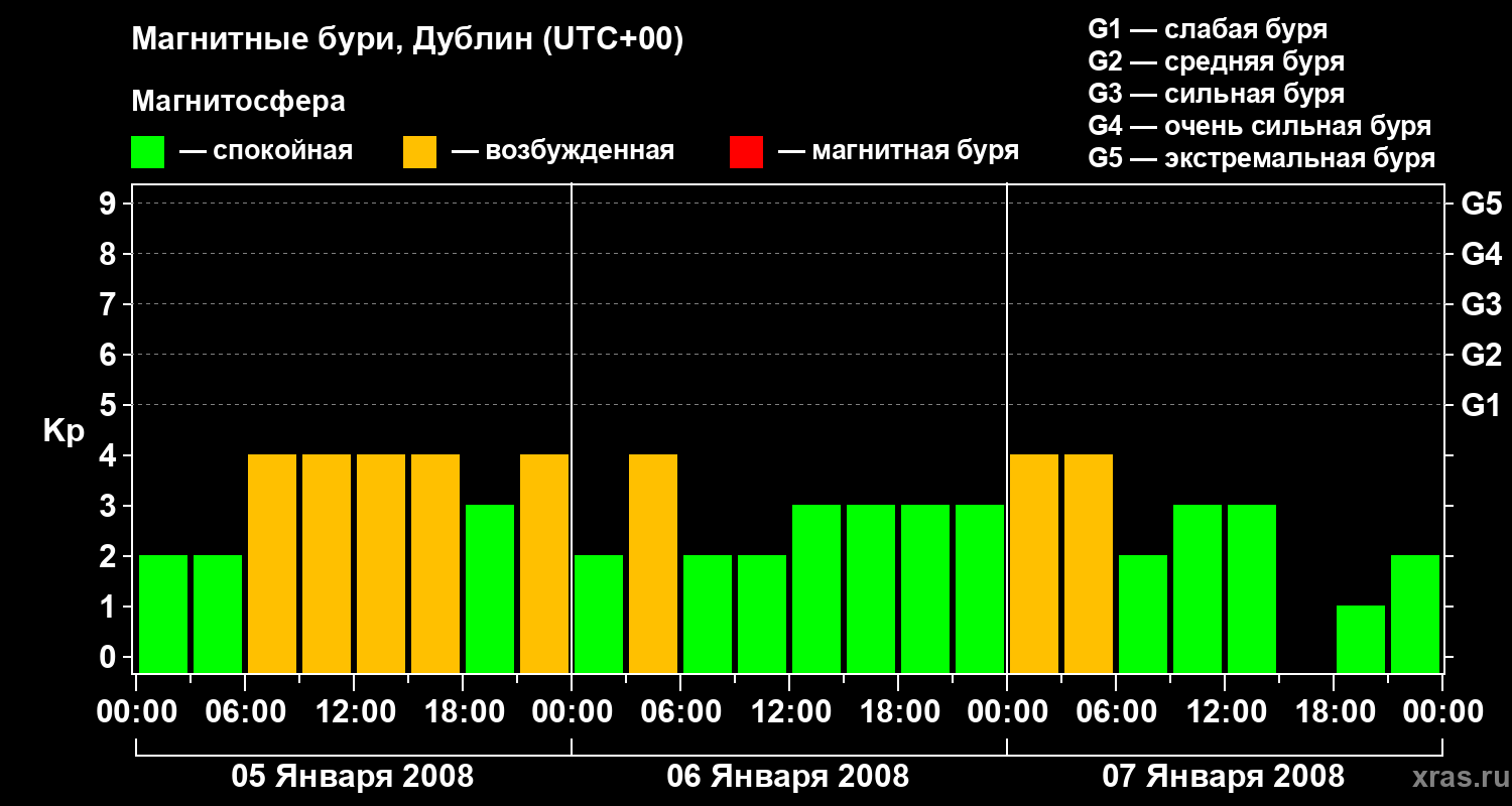 Изменения геомагнитного индекса Kp с 5 по 7 января 2008 года для средних широт