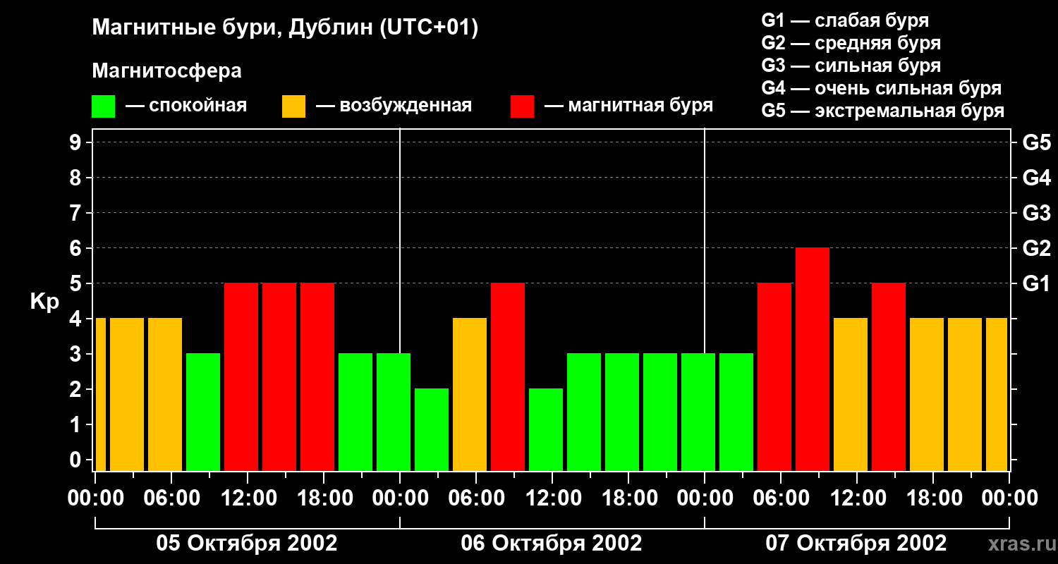 Изменения геомагнитного индекса Kp с 5 по 7 октября 2002 года для средних широт
