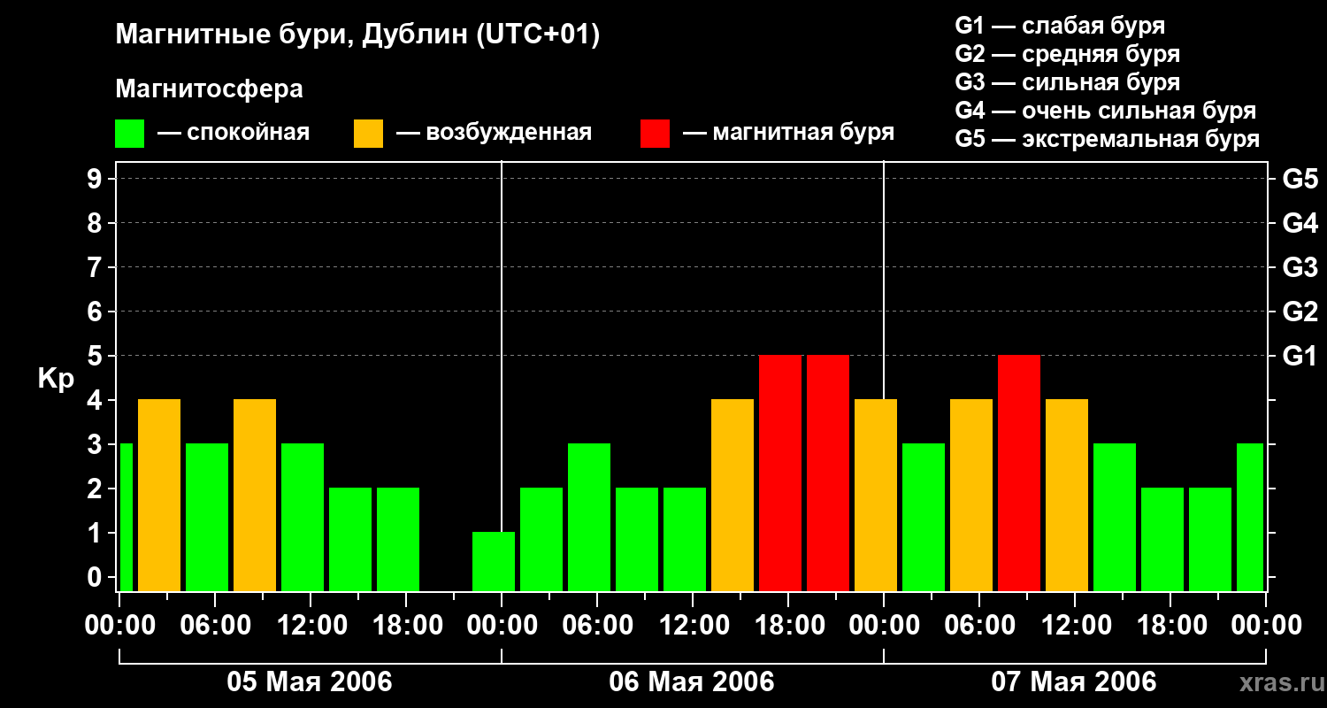 Изменения геомагнитного индекса Kp с 5 по 7 мая 2006 года для средних широт