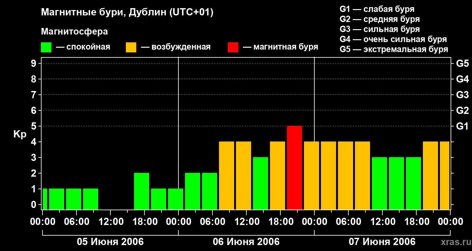 Изменения геомагнитного индекса Kp с 5 по 7 июня 2006 года для средних широт