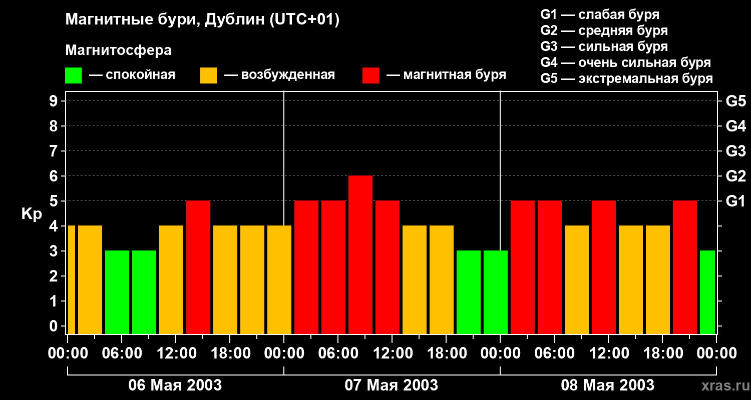 Изменения геомагнитного индекса Kp с 6 по 8 мая 2003 года для средних широт