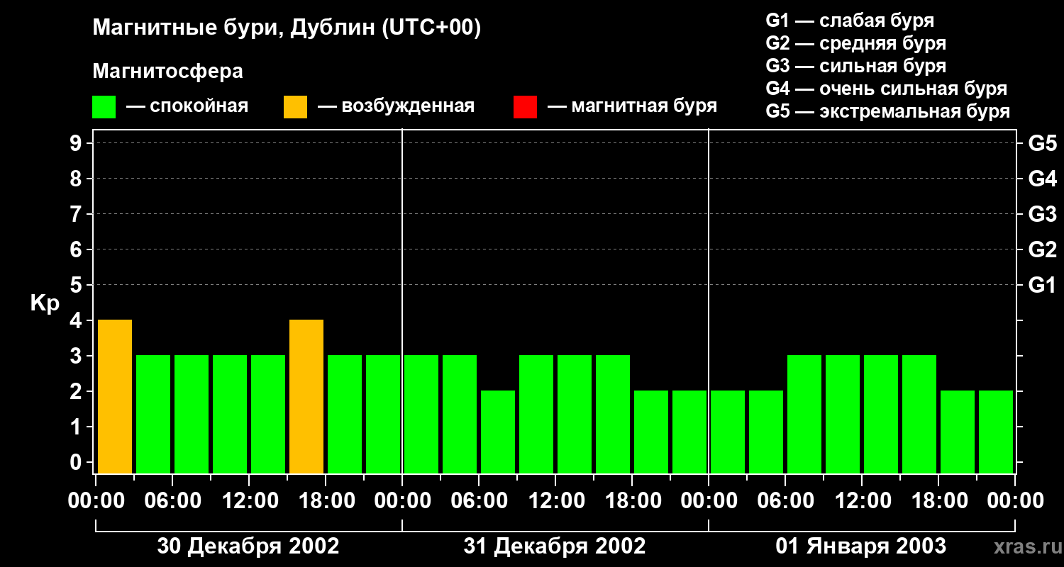 Изменения геомагнитного индекса Kp с 30 декабря 2002 года по 1 января 2003 года для средних широт