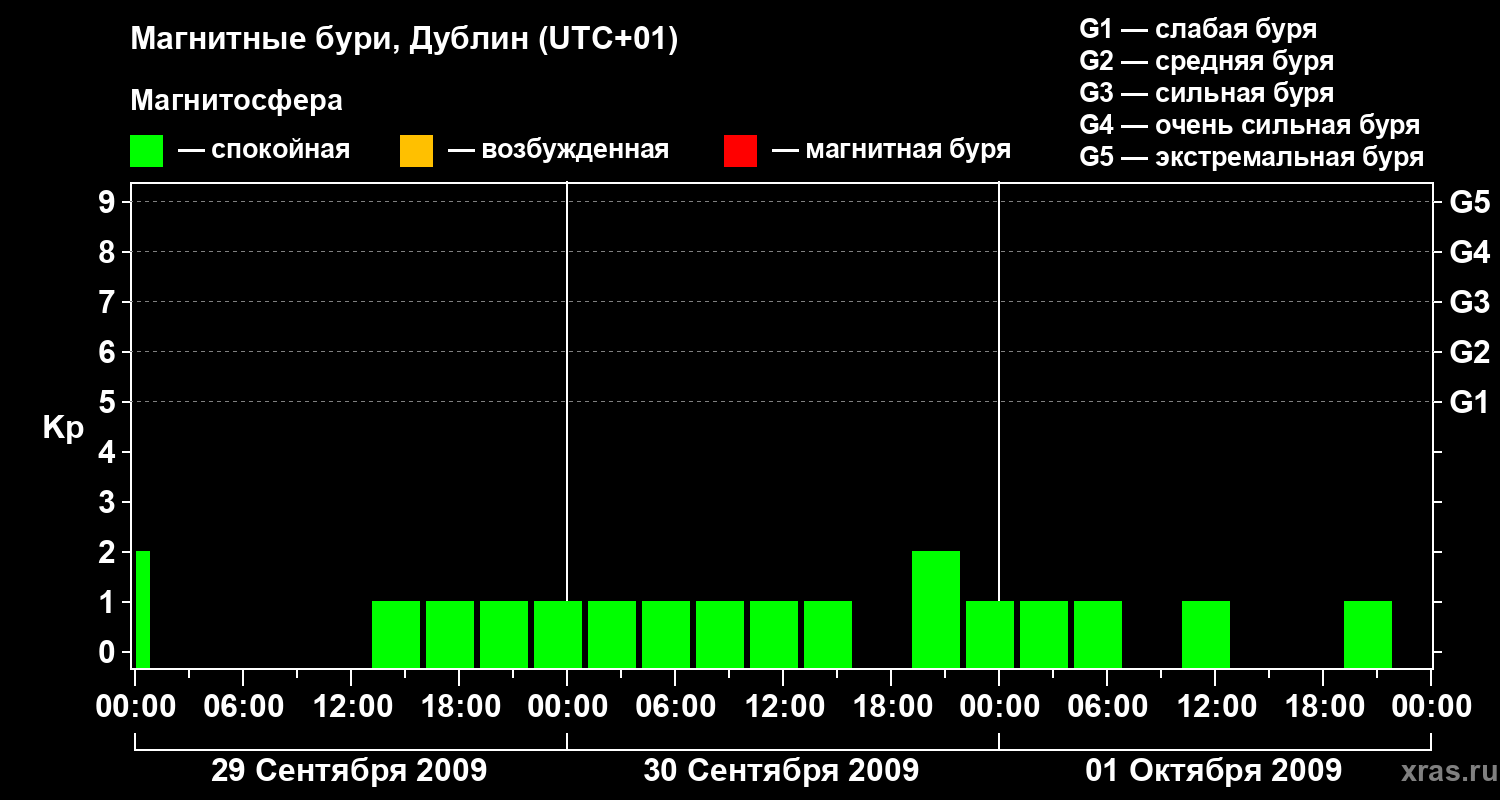 Изменения геомагнитного индекса Kp с 29 сентября по 1 октября 2009 года для средних широт