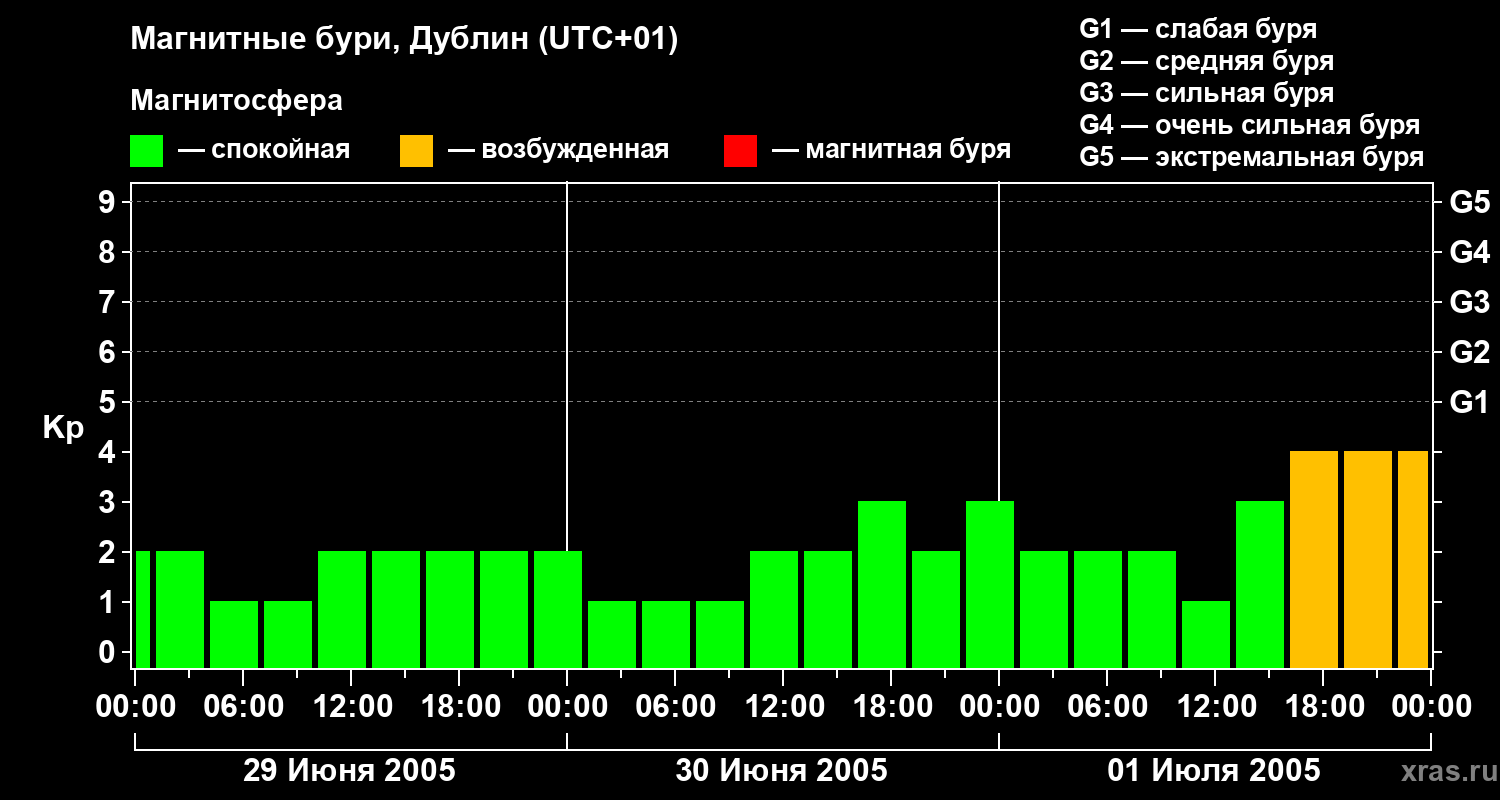Изменения геомагнитного индекса Kp с 29 июня по 1 июля 2005 года для средних широт