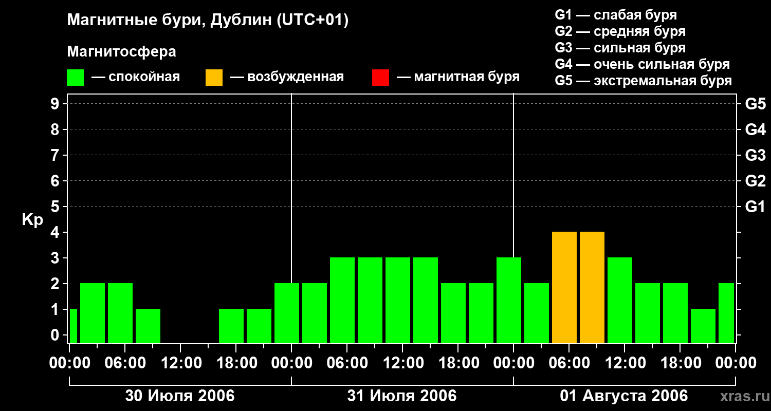 Изменения геомагнитного индекса Kp с 30 июля по 1 августа 2006 года для средних широт