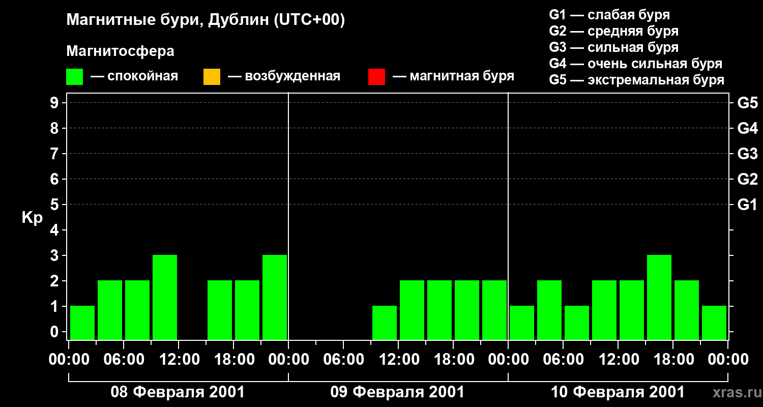 Изменения геомагнитного индекса Kp с 8 по 10 февраля 2001 года для средних широт