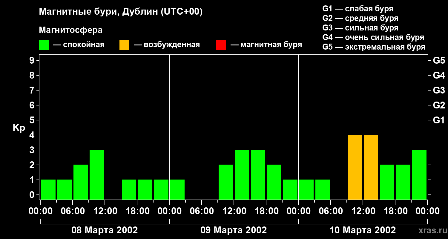Изменения геомагнитного индекса Kp с 8 по 10 марта 2002 года для средних широт
