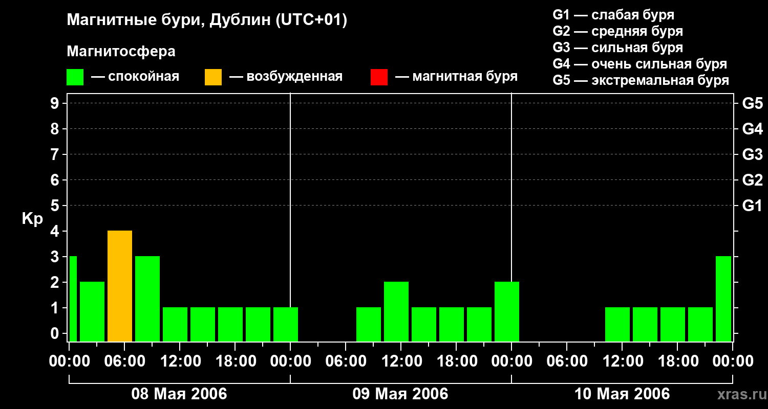 Изменения геомагнитного индекса Kp с 8 по 10 мая 2006 года для средних широт