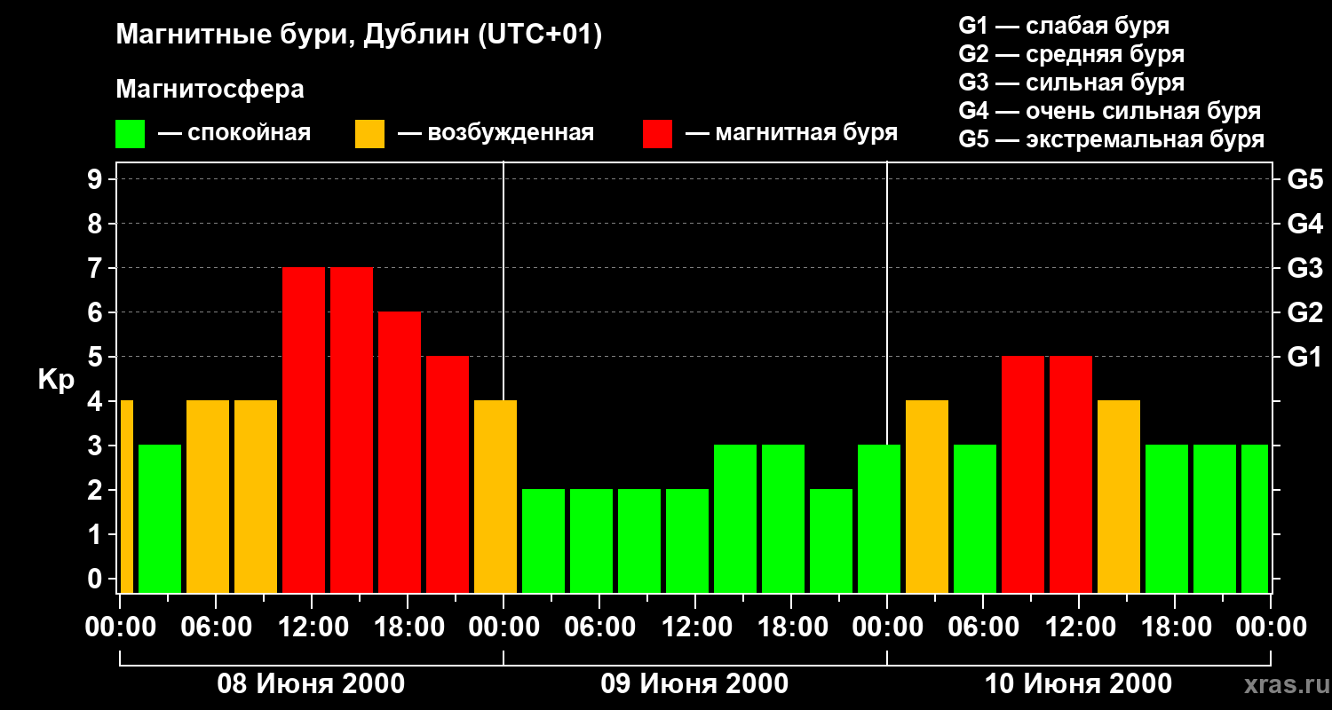 Изменения геомагнитного индекса Kp с 8 по 10 июня 2000 года для средних широт
