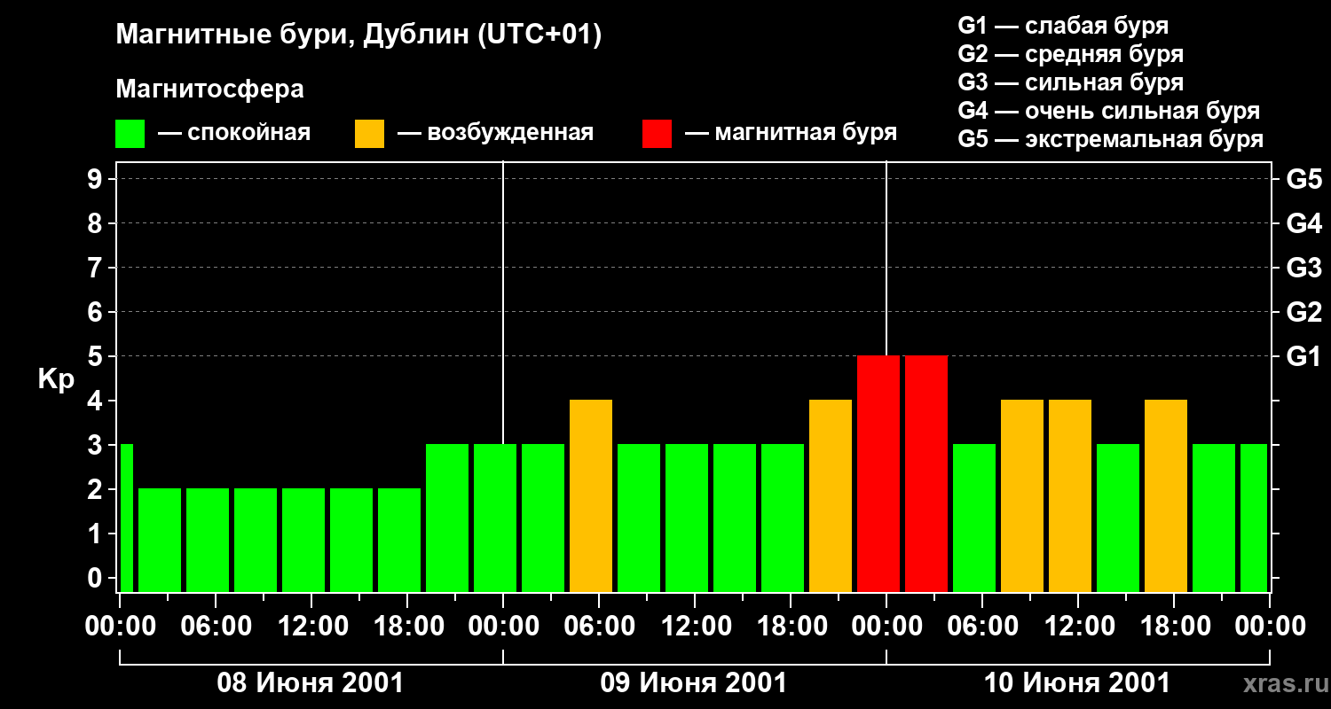 Изменения геомагнитного индекса Kp с 8 по 10 июня 2001 года для средних широт